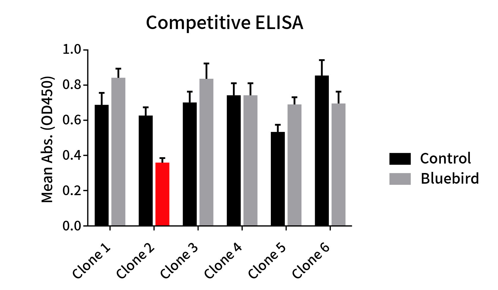 Figure 4: Epitope comparison between different anti-BCMA clones and anti-BCMA huC11D5.3 clone (Bluebird bb2121). ELISA plate was coated with recombinant BCMA-hFc fusion protein, followed by pre-blocking with huC11D5.3 antibody (Grey bar) or rabbit control IgG (Black bar) and then different rabbit DimAbs antibodies were added to check the competitive inhibition of huC11D5.3. One clone exhibits the strongest inhibition (Red bar). This data indicated that one clone binds to the same epitope as bb2121.