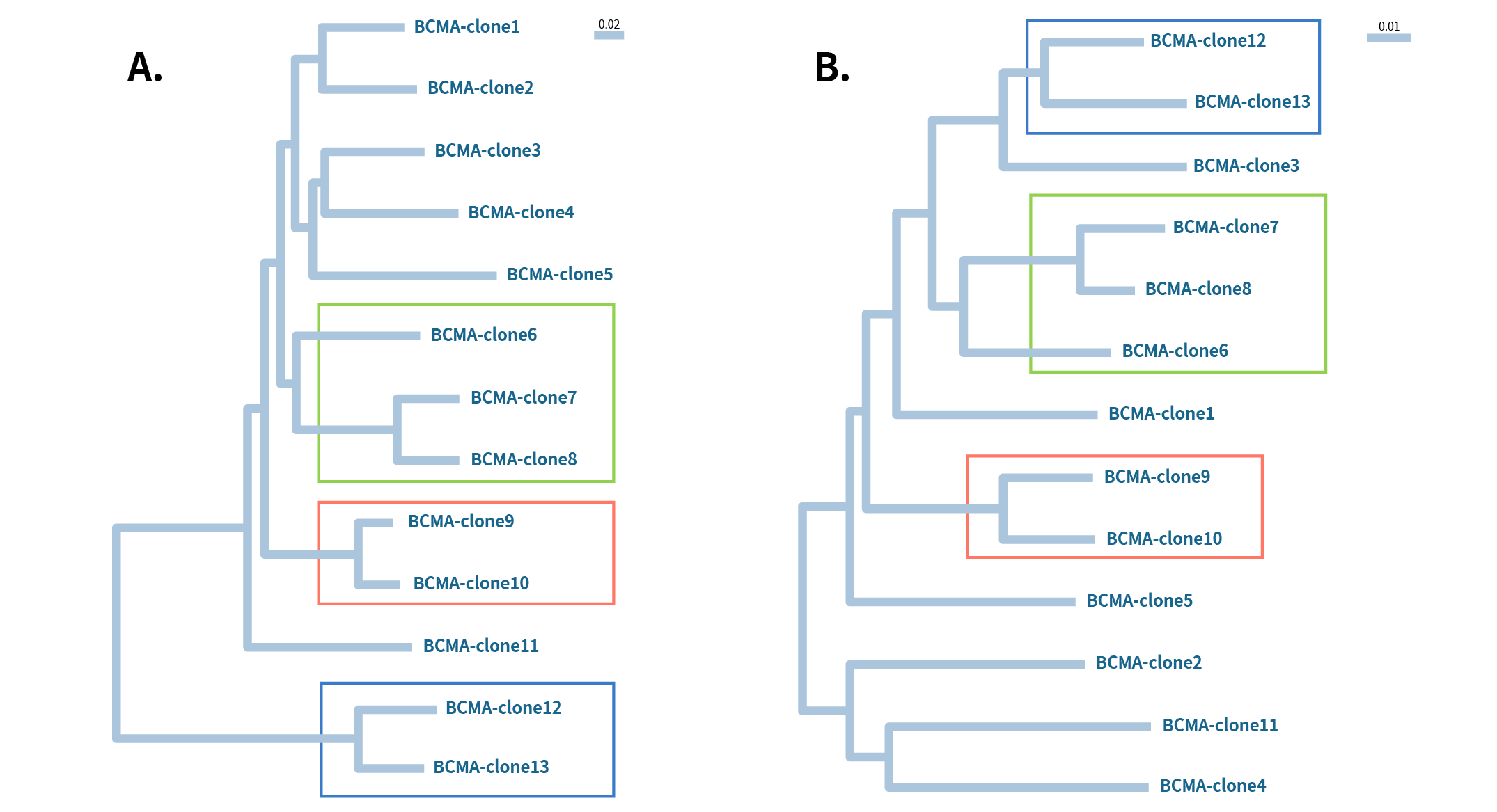 Figure 3: Phylogenetic analysis of 13 different Anti-BCMA clones A) heavy chain and B) Light chain. All these clones work for flow application. The boxed regions indicate heavy and light chains of the same clone come from the same lineage group.