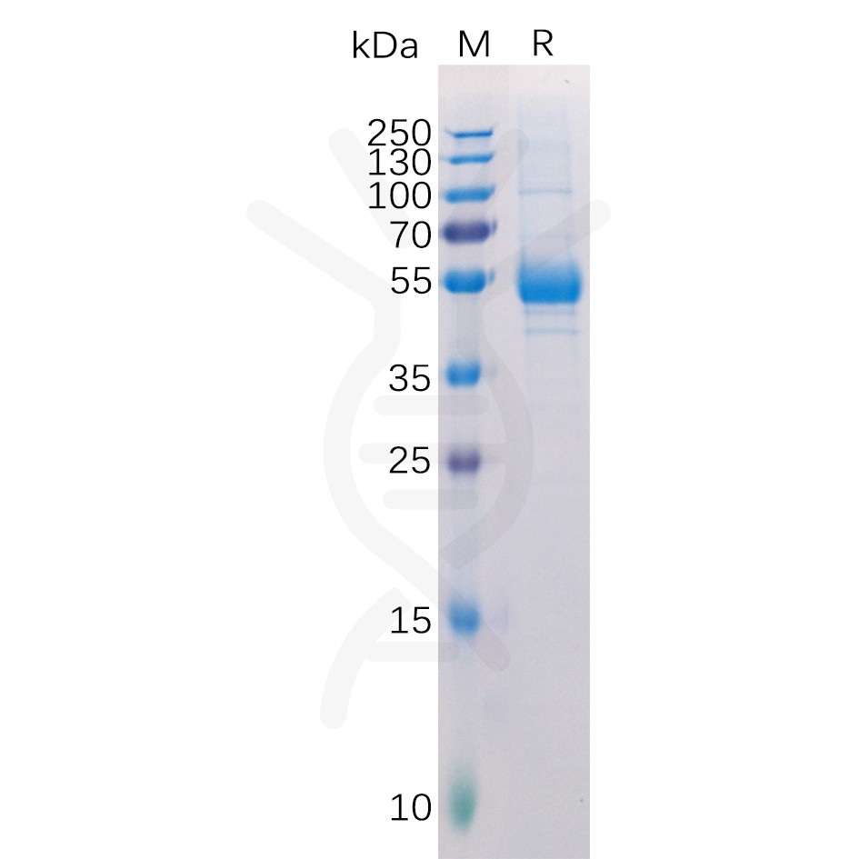 | Molecular Weight | The protein has a predicted molecular mass of 48.4 kDa after removal of the signal peptide.The apparent molecular mass of hFc-TNFSF11 is approximately 55-70 kDa due to glycosylation. |